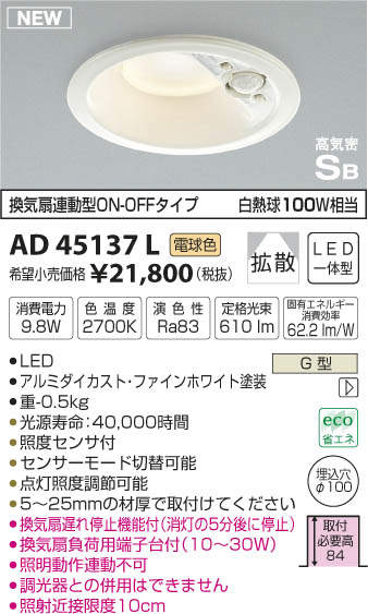 カテゴリ:照明器具 ダウンライト メーカー:コイズミ照明 koizumi 型番:AD45137L白熱球100W相当 ※写真はイメージです 2016年8月のメーカー情報に準拠しております。