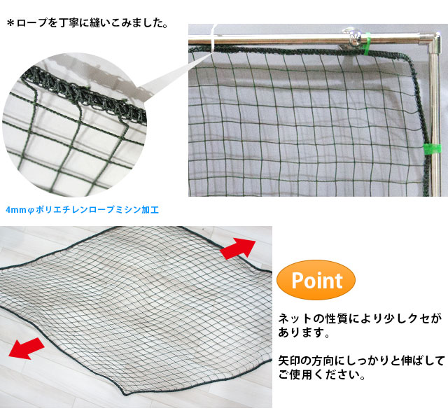 糸【材質】 ポリエチレン 重量 約108g/平米 周囲仕上げ 4φポリエチレンロープ(グレー)ミシン加工 ご注意 ・サイズは幅・丈とも1cm単位より指定できますが、網目に依存するので少し大きめに仕上がります。